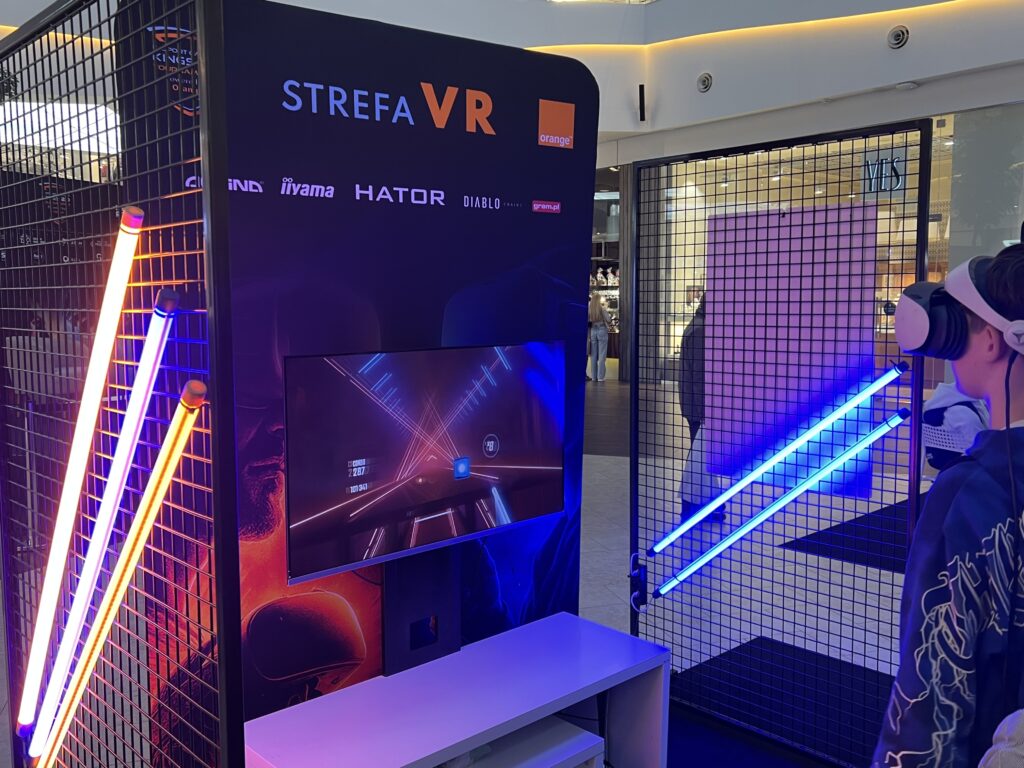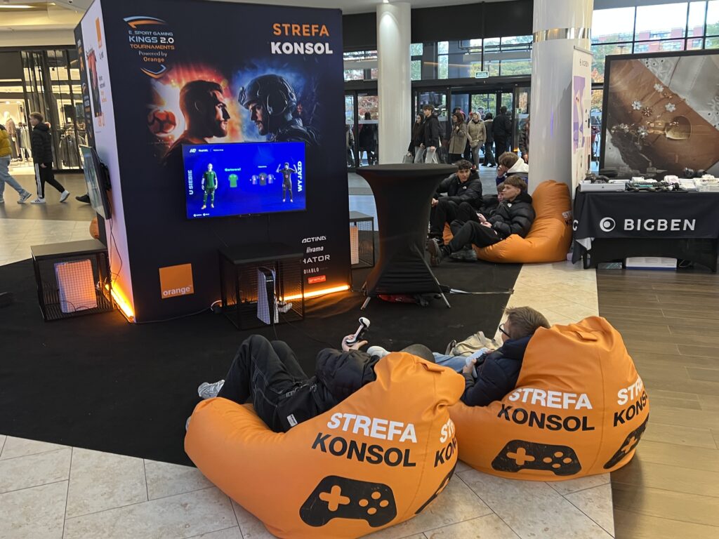 - Strefy „FREE TO PLAY”. Dla każdego: PC (10 stanowisk), konsole PS5, retro (powrót do lat 80/90), VR, strefa kibica z dużym ekranem i strefa relaksu Orange. We Wrocławiu działała też aktywacja SPOT x E-SPORT z wyścigowymi symulatorami.
