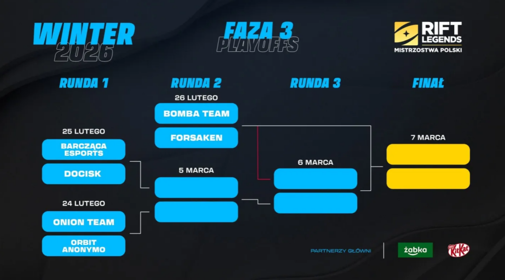 Faza druga Rift Legends Winter Split 2026 dobiegła końca. Po emocjonującym Swiss Stage na LAN-ie we Wrocławiu przyszedł czas na rywalizację w dwóch grupach BO2, która wyłoniła szóstkę uczestników playoffów. Teraz liga wchodzi w decydującą fazę – drabinkę double elimination, w której wszystkie mecze rozegrane zostaną w formacie BO5. Stawka? Tytuł mistrza i awans do EMEA Masters Winter.